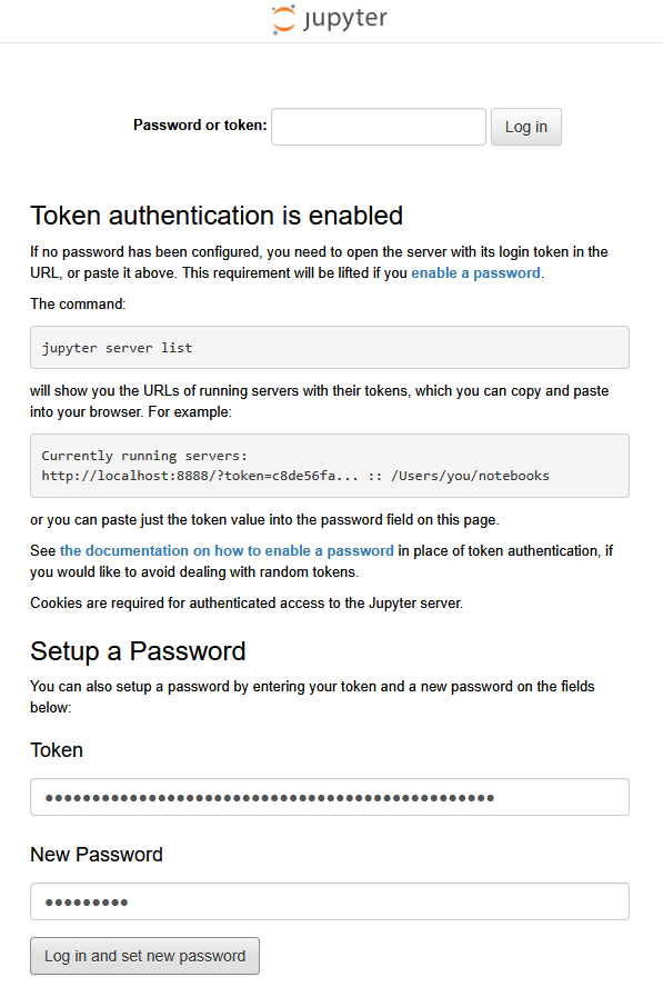 In the browser, after a first login via http://localhost:8888, paste the token into the "Token" field then set a password in "New password" for future access.